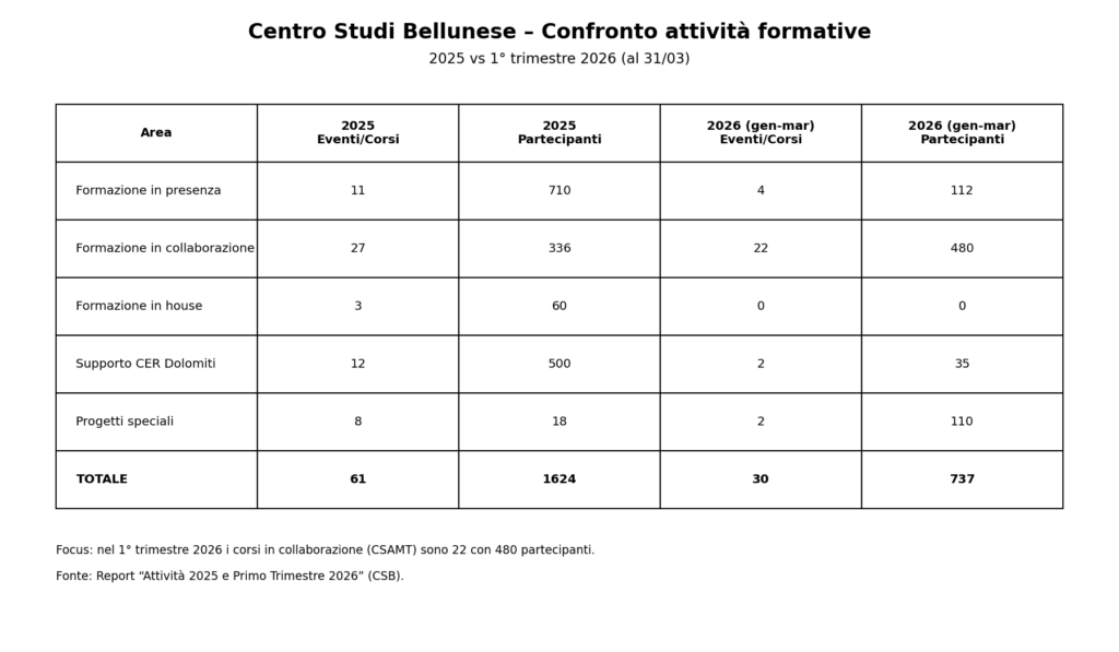 Nel primo trimestre 2026 il Centro Studi Bellunese (CSB) ha registrato oltre 700 partecipanti alle iniziative di formazione e divulgazione: 737 presenze complessive al 31 marzo, distribuite tra corsi, incontri e progetti speciali, per un totale di 29 appuntamenti, 30 se si conteggia anche una presentazione tecnica interna. Il dato registra una forte crescita della partecipazione alle attività formative del Centro già solo rispetto al 2025.