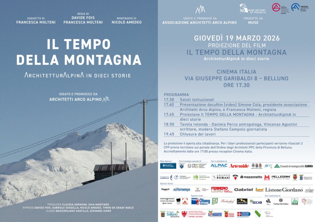 La prima nazionale è andata in scena a Milano, lo scorso 5 marzo 2026, in una collocazione simbolica tra la conclusione dei Giochi Olimpici e l’avvio delle Paralimpiadi invernali, ora il film arriva a Belluno il prossimo 19 marzo: l’appuntamento è alle ore 17.30 al Cinema Italia, seguirà una tavola rotonda dedicata al rapporto tra architettura, paesaggio e comunità di montagna. L’evento realizzato grazie al contributo del Consorzio Bim Piave di Belluno, vedrà la partecipazione dell’antropologa Daniela Perco, già direttrice del Museo Etnografico Dolomiti e studiosa delle culture alpine e dello scrittore Vincenzo Agostini, autore di testi dedicati al rapporto tra uomo, montagna e immaginario collettivo.