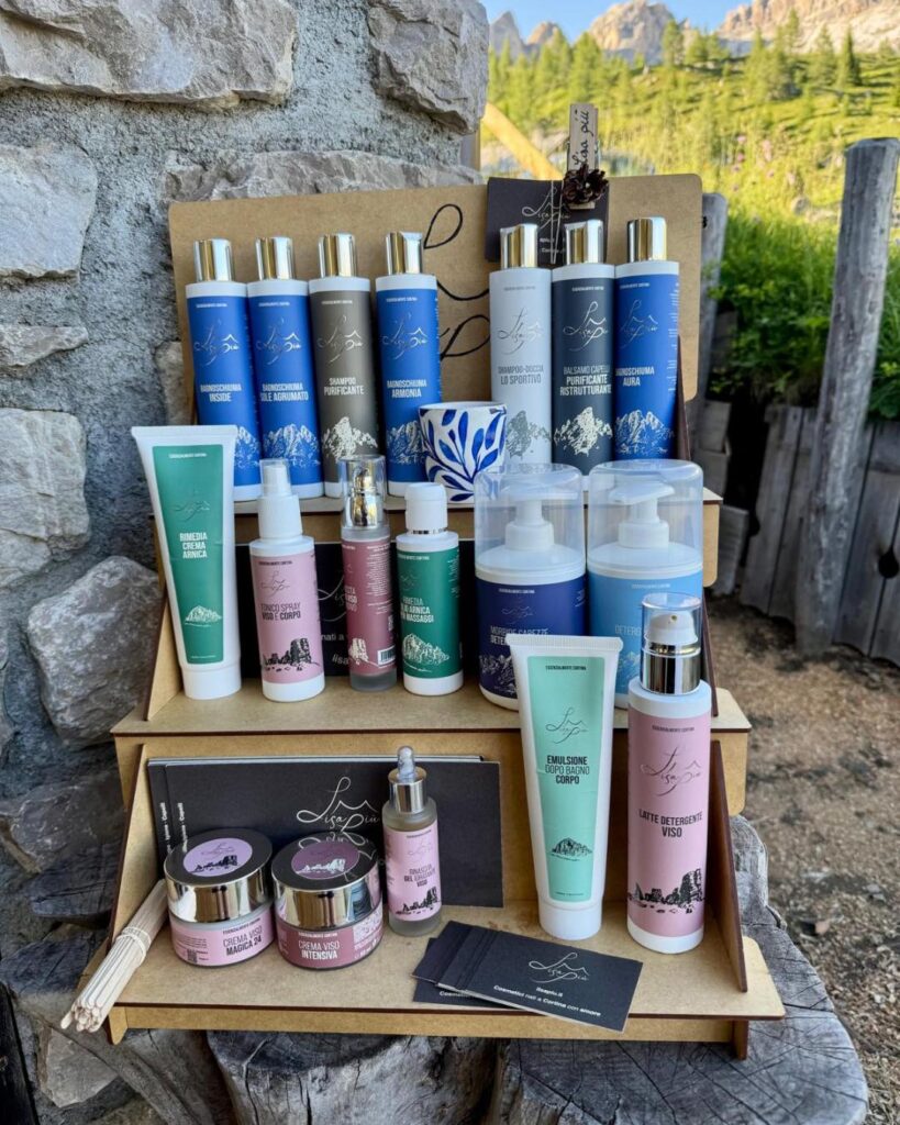 Si tratta di una linea di 18 preparati per viso, detersione, corpo e capelli, completa però essenziale, di nicchia, con componenti che provengono preferibilmente dal territorio delle Dolomiti. «Mi rivolgo a produttori di Colle Santa Lucia, Pieve, Brunico, e sono sempre alla ricerca di qualcuno che voglia collaborare con me con i loro prodotti naturali. Non sono riuscita ad avere un mio laboratorio a Cortina, quindi mi sono rivolta a quello più vicino che è a Padova. Al laboratorio io do le direttive per la formulazione dei miei prodotti e tutte le indicazioni riguardo i fornitori delle materie prime, che sono rigorosamente controllate e analizzate».